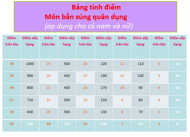 d) Cách tính điểm- Căn cứ vào điểm chạm trên bia để cộng điểm vào đối chiếu với bảng điểm để qui ra điểm từng VĐV. - VĐV có số điểm cao hơn xếp trên. Nếu bằng nhau, sẽ so sánh ai có điểm chạm 10, 9, 8 nhiều hơn xếp trên, nếu vẫn bằng nhau thì xếp đồng hạng. - Giỏi: 25 điểm trở lên = 560 -1000 - Khá: 20 - 24 điểm. = 300 - 500 - Đạt : 15 - 19 điểm. = 150 - 250 - K/ đạt: dưới 14 điểm. = 130 - 0 |