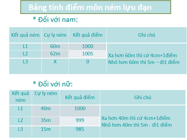 e) Cách tính điểm- Căn cứ vào thành tích quả ném xa nhất, đối chiếu với bảng điểm để quy ra điểm (xem bảng tính điểm). - VĐV nào có số điểm cao hơn xếp trên. Nếu bằng nhau, xét trực tiếp quả ném đó, nếu vẫn bằng nhau thì xét quả thứ 2, thứ 3. - Đối với nam + 60m được tính 1000 điểm. + Xa hơn 60m, cứ 4cm được 1 điểm + Thấp hơn 60m, cứ 5m trừ đi 1 điểm. - Đối với nữ + 40m được 1000 điểm. + Xa hơn 40m, cứ 4cm được 1 điểm + Thấp hơn 40m, cứ 5m trừ đi 1 điểm. (Điểm tính tròn: Từ 3cm trở lên được tính tròn 1 điểm, dưới 3cm thì không điểm). |