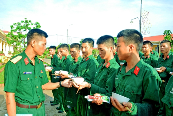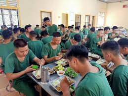 f) Ăn uống- Người chỉ huy đơn vị có tổ chức bếp ăn phải quản lý nhà ăn, nhà bếp, bảo đảm tiêu chuẩn định lượng; ăn sạch, ăn nóng và ăn đúng giờ quy định. Hàng ngày chỉ đạo trực ban, tổ kinh tế, quân y kiểm tra số người ăn; số lượng, chất lượng lương thực, thực phẩm sử dụng theo tiêu chuẩn được hưởng; vệ sinh nhà ăn, nhà bếp sạch sẽ. - Thực hiện kinh tế công khai trong ngày, tháng; giải quyết mọi thắc mắc, đề nghị về ăn uống của quân nhân. - Cán bộ, chiến sĩ phục vụ nhà ăn phải nêu cao ý thức trch nhiệm phục vụ, có kế hoạch tiếp phẩm, cải tiến kỹ thuật nấu ăn; giữ vệ sinh, chăm lo bữa ăn, bảo đảm sức khoẻ bộ đội. - Bảo quản lương thực, thực phẩm, chất đốt, cân đong, đo, đếm chính xác, có sổ sách ghi chép xuất, nhập đầy đủ, tránh để hao hụt, lảng phí tham ô. Hàng ngày, tuần, tháng cùng với hội đồng kinh tế của đơn vị tiến hành kiểm kho, báo cáo kinh tế công khai trước mọi quân nhân. - Khi làm việc phải mặc quần áo công tác. Người đang mắc bệnh truyền nhiễm hoặc bệnh ngoài da không trực tiếp nấu ăn và chia cơm, thức ăn. - Đối với người ốm tại trại, nếu không đến được nhà ăn, trực ban và quân y phải mang cơm về cho người ốm. Những suất chưa ăn, nhân viên nhà ăn phải đậy lại cẩn thận. Cấm sử dụng thức ăn nấu chưa chín, ôi thiu; thịt súc vật bị bệnh, đồ hộp hỏng; các loại lương thực, thực phẩm của địch bỏ lại chưa được quân y kiểm tra. Cấm để chất độc, vật bẩn, hôi hám vào khu thực phẩm, nhà bếp, nhà ăn. Nếu dùng thuốc diệt muỗi, chuột, mối phải có biện pháp quản lý chặt chẽ. Nước ăn, uống phải trong, sạch. Nước uống, nước nhúng bát đũa phải đun sôi. - Mỗi bữa ăn phải để lại một phần suất ăn làm lưu nghiệm do quân y quản lý. Sau 24 giờ không có việc gì xảy ra mới bỏ đi. - Khi đến nhà ăn: + Phải đúng giờ, đi ăn trước hay sau giờ quy định phải được chỉ huy hoặc trực ban đơn vị đồng ý và báo trước cho nhà bếp. Hạ sĩ quan, binh sĩ, học viên chưa phải là sĩ quan đến nhà ăn phải tập hợp đi thành đội ngũ. Trước khi ăn phải nhúng bát đũa qua nước sôi, ăn xong xếp gọn bát, đĩa trên bàn, xếp ghế vào gầm bàn trước khi rời nhà ăn. |