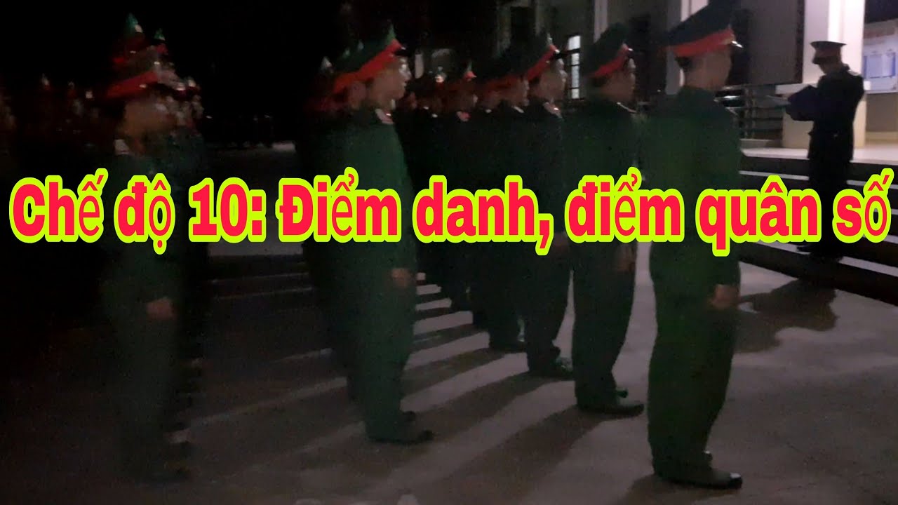 k) Điểm danh, điểm quân số- Hàng ngày trước giờ ngủ phải tiến hành điểm danh, điểm quân số, nhằm quản lý chặt chẽ quân số, bảo đảm sẵn sàng chiến đấu. + Trung đội và tương đương mỗi tuần điểm danh 2 lần. Các tối khác điểm quân số. + Đại đội và tương đương mỗi tuần điểm danh 1 lần. + Chỉ huy tiểu đoàn và tương đương mỗi tuần dự điểm danh của 1 đại đội. Thời gian điểm danh hoặc điểm quân số không quá 30 phút. Điểm danh, điểm quân số cấp nào do chỉ huy cấp đó trực tiếp tiến hành. - Đến giờ điểm quân số mọi quân nhân có mặt tại đơn vị phải tập hợp thành đội ngũ, trang phục đúng quy định. + Chỉ huy đơn vị đọc danh sách các quân nhân ở từng phân đội theo quân số đơn vị quản lý (đọc cấp bậc, họ tên từng quân nhân). Quân nhân nghe đọc tên mình phải trả lời “Có”. Quân nhân vắng mặt, người chỉ huy trực tiếp của quân nhân đó trả lời “Vắng mặt” kèm theo lý do. + Điểm danh xong, người chỉ huy nhận xét và phổ biến công tác ngày hôm sau; + Khi điểm quân số cũng tiến hành như điểm danh nhưng không phải gọi tên. Người chỉ huy trực tiếp kiểm tra quân số thuộc quyền, sau đó báo cáo theo hệ thống tổ chức lên người chỉ huy điểm quân số. Nhận báo cáo xong, người chỉ huy điểm quân số có thể kiểm tra lại toàn bộ hoặc một số phân đội. |