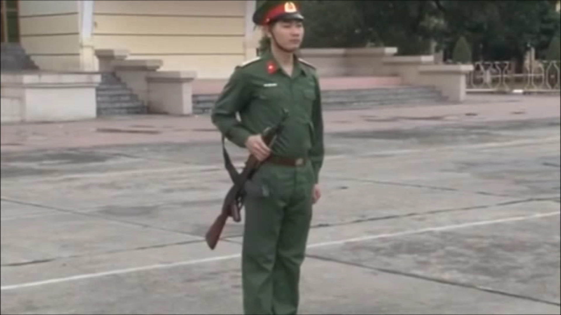 | - Cử động 4: Dùng sức đẩy của tay trái và sức xoay của tay phải đưa súng sang bên phải ra sau, quàng dây súng vào vai phải, tay trái đưa về thành tư thế đứng nghiêm mang súng. | ![]() |